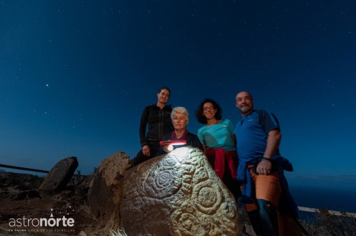 En Garafía, la ruta comienza al atardecer recorriendo el entorno natural donde habitaron los awara, después con la noche, te descubrimos el significado de los petroglifos en una mágica ruta bajo las estrellas, en la que conocerás las costumbres, cultura y cosmovisión de aborígenes palmeros. También te enseñaremos a reconocer las principales estrellas y constelaciones; y observaremos con potentes prismáticos la superficie lunar.