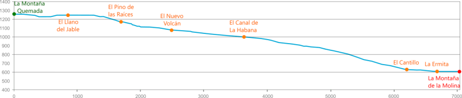 - Sendero lineal, de 7,8 kilómetros de recorrido desde el Llano del Jable hasta la Cueva de Las Palomas, que transcurre por encima de los 1.000 metros de altitud, por suelo de arena y picón (lapilli).